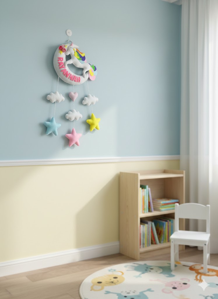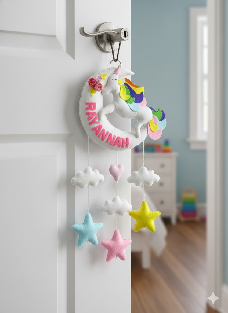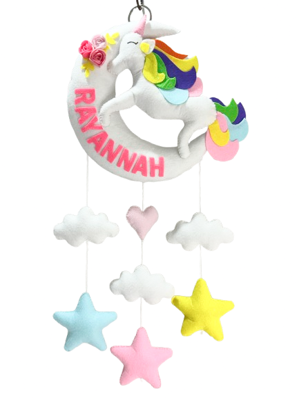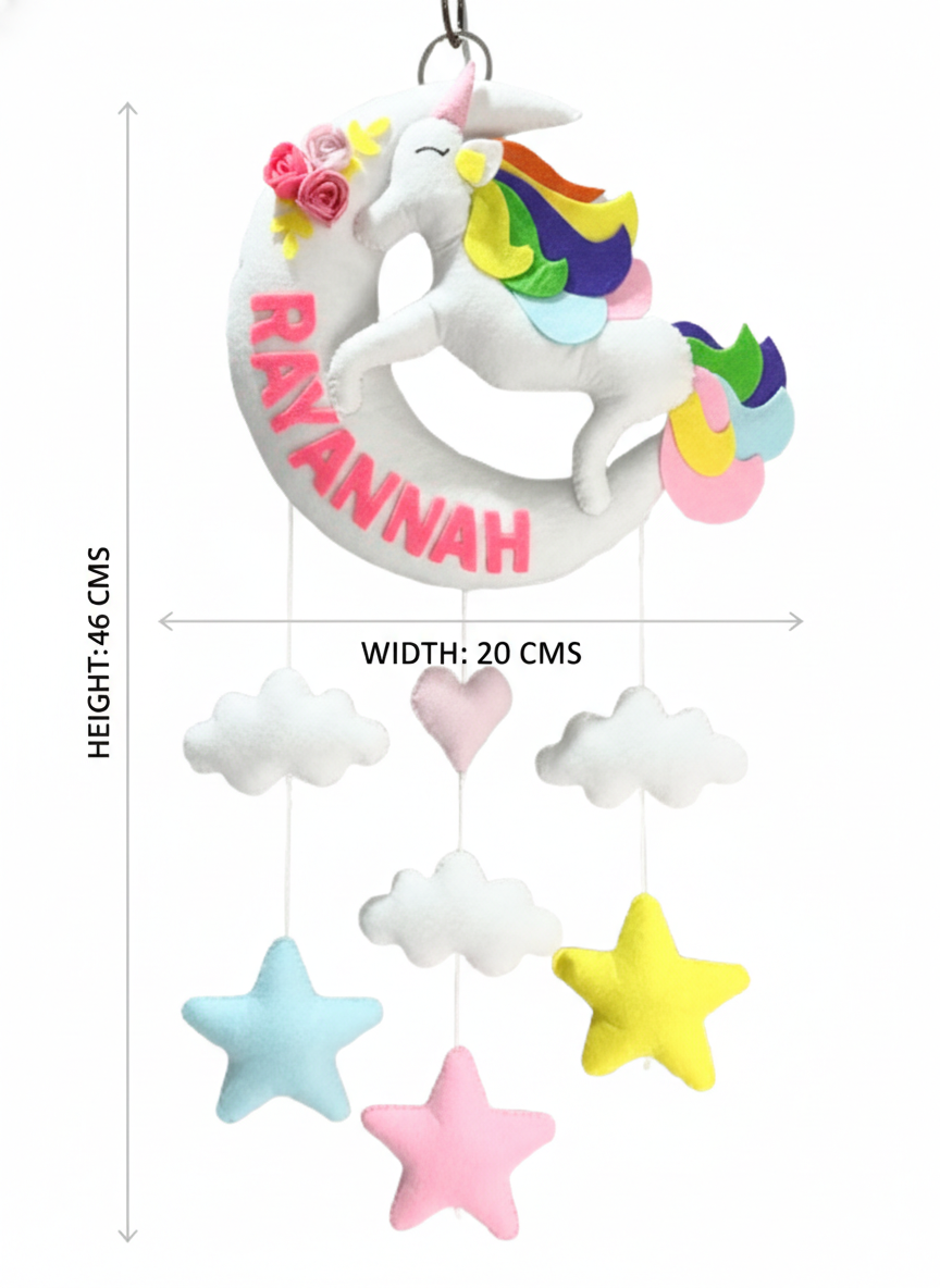 A beautiful room décor in Moon Unicorn theme, personalized with your child name. An awesome personalize gifting option for a New born Baby girl for gifting on any occassion.
