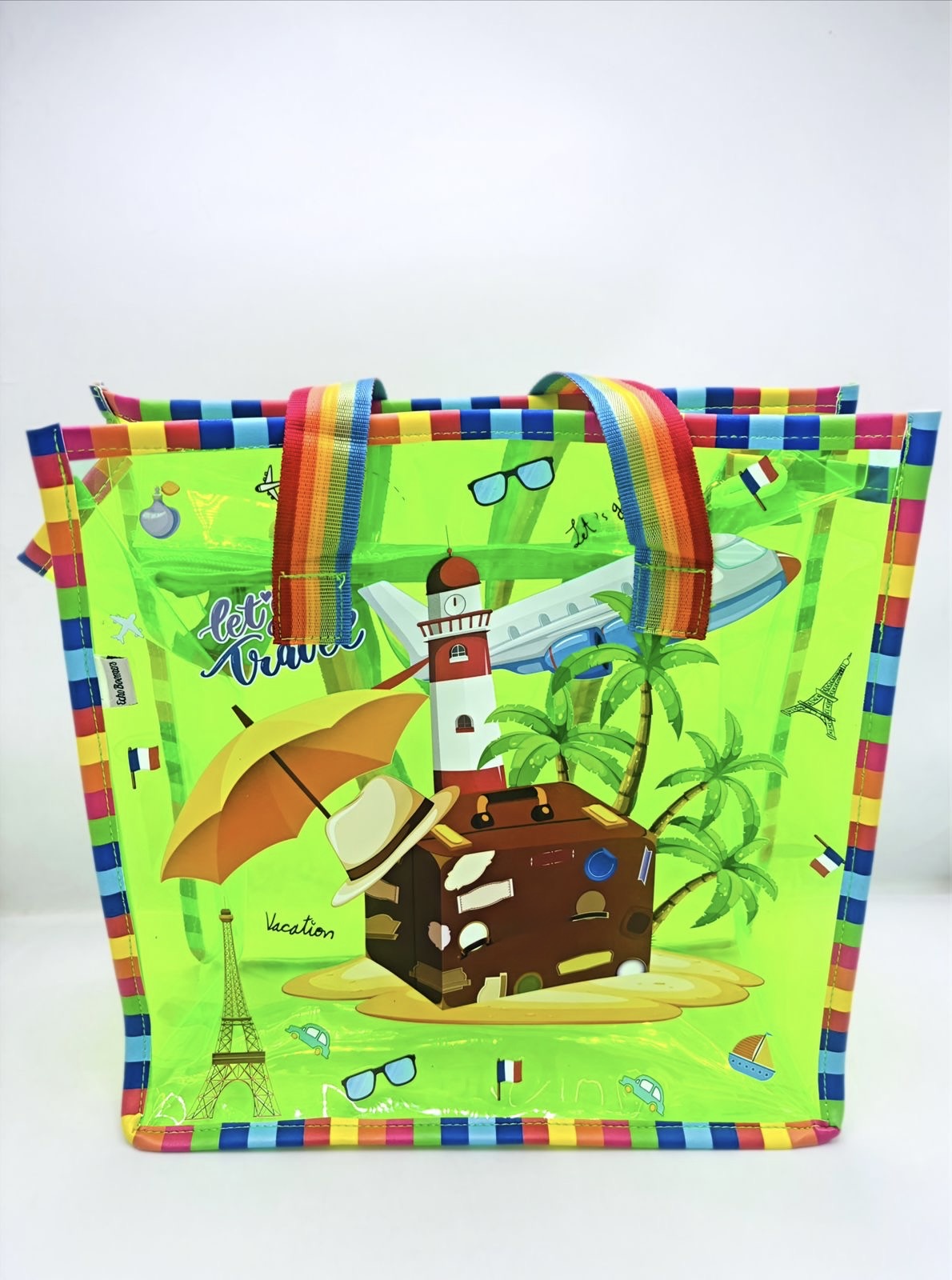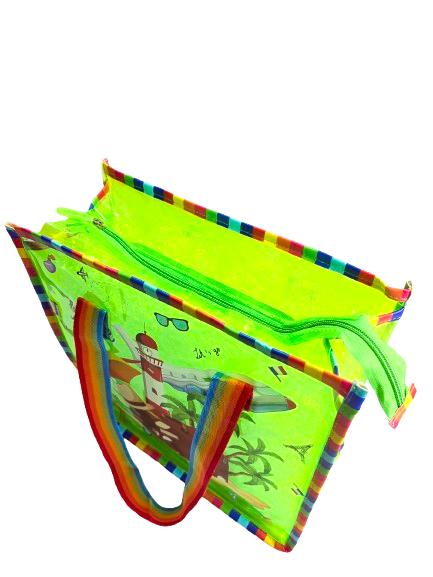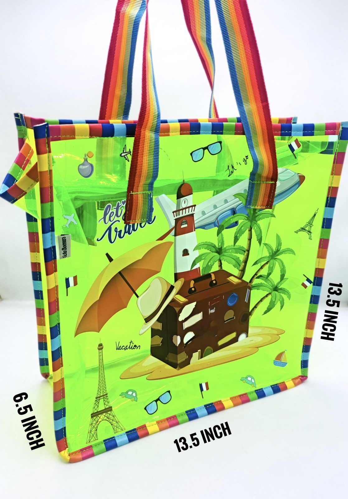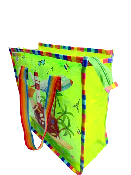 Meet the bag that refuses to be ignored. Our Electric green Explorer Tote is the ultimate carry-all for the bold. From its rainbow-striped handles to its quirky travel graphics, this bag is a mood-lifter you can wear.