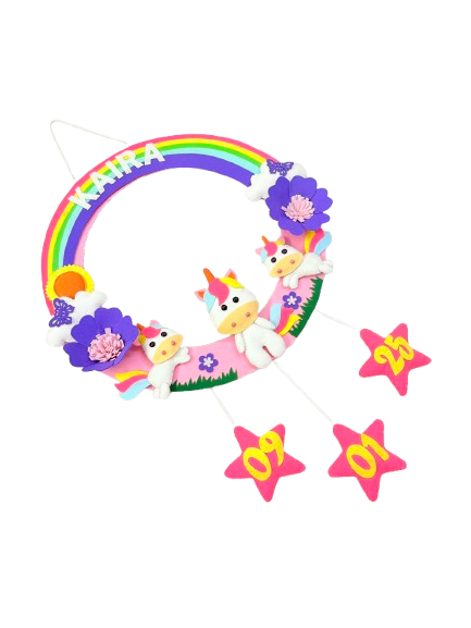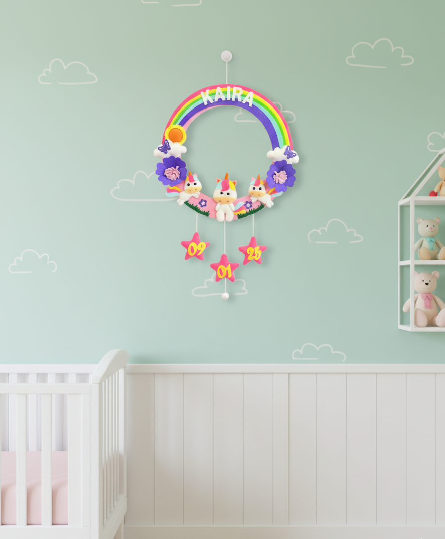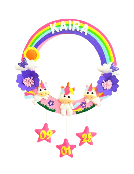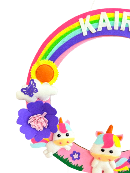 Bring a touch of magic and whimsy to your little one’s space with our enchanting Personalized Rainbow Unicorn Name Hanging. Handcrafted with love and attention to detail, this unique decor piece features a soft felt rainbow, beautful unicorns surrounded with enchanted handmade flowers.